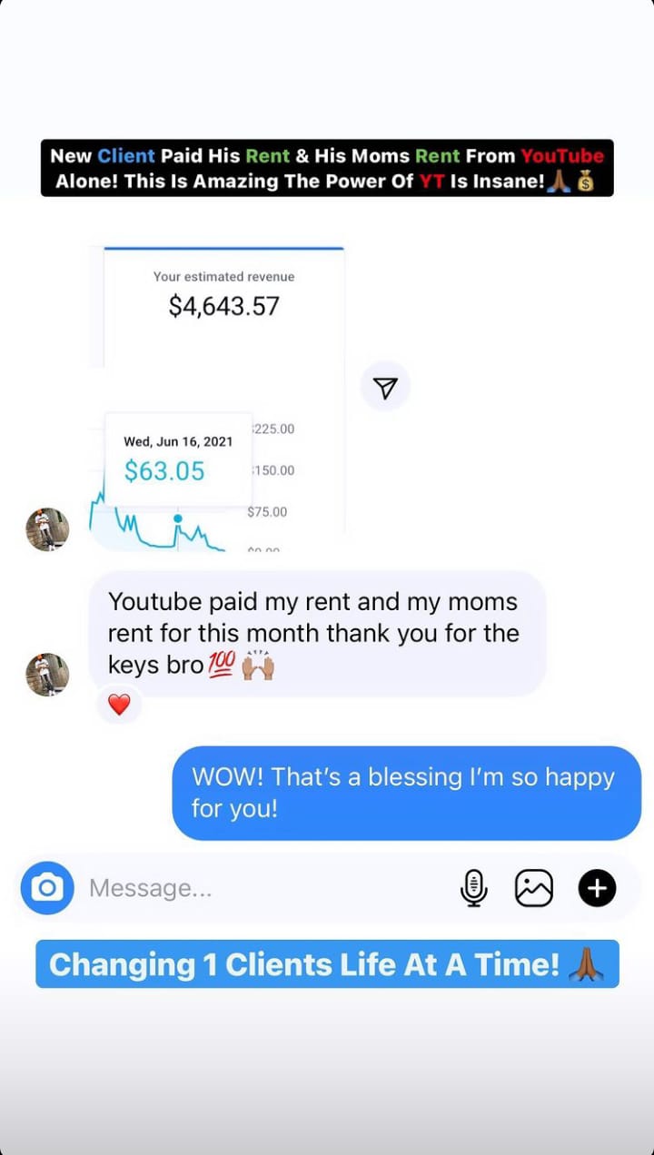 I can’t thank you enough! YouTube literally paid my rent this month — and even covered my mom’s rent. Before working with you, I was struggling to grow my channel and make consistent income. Thanks to your ready-made monetized channel and growth strategy, everything changed. The content plan, automation system, and your guidance made it so easy to scale. I’m now earning steady revenue and finally feel in control of my future. Honestly, you really helped me turn my passion into a reliable business — I couldn’t be more grateful!
